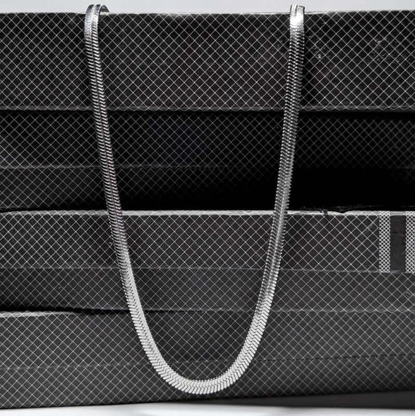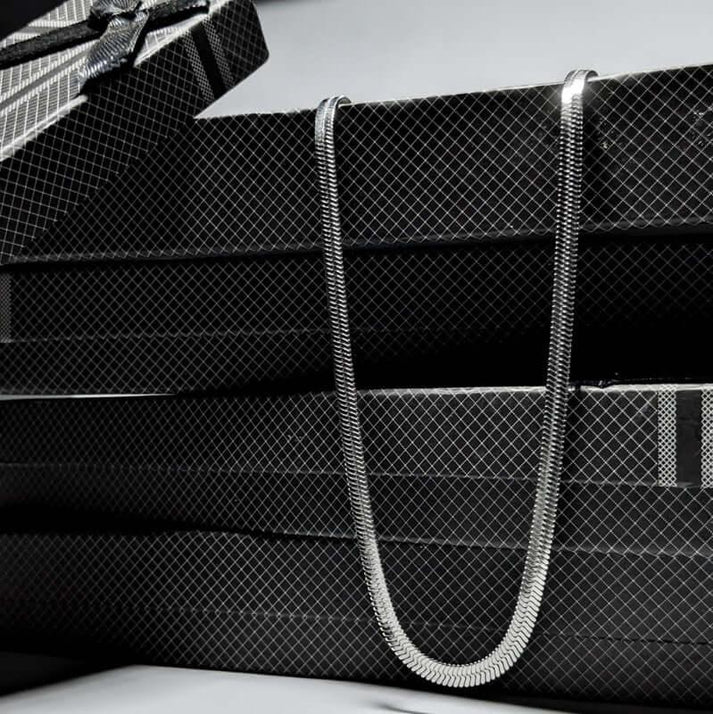 Designed for men who appreciate confident style, the 5mm flat snake chain features a smooth, reflective surface that rests comfortably against the skin. Its wider profile creates a strong, masculine look — ideal for wearing alone as a statement piece or pairing with pendants for layered styling.
