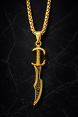 Meticulously crafted in radiant gold, the dagger-inspired design reflects power and precision, enhanced with deep black stone detailing that adds depth, contrast, and bold character. Suspended on a premium gold chain, every element is refined to perfection, capturing light with a cinematic brilliance worthy of elite taste.